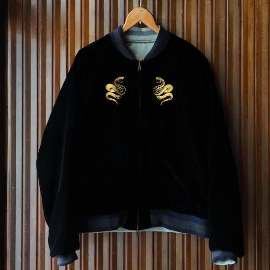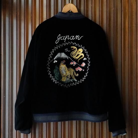 プレーンなスタイルながら、漆黒のベルベットとフライトジャケットサテンのリバーシブルが贅沢なスカジャンです。アーカイブからトラにフジをピックアップ。ブラッシュアップした刺しゅう柄は表と裏でそれぞれ表情の異なる柄にしています。