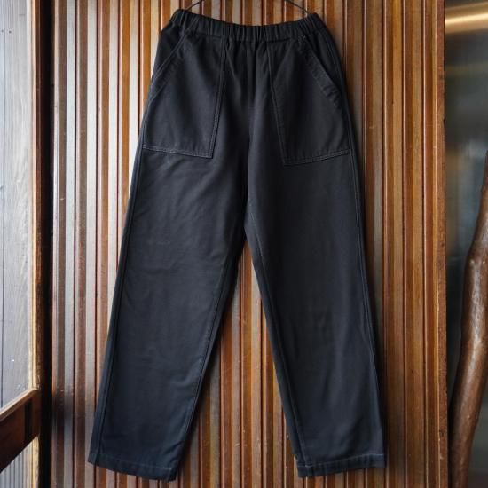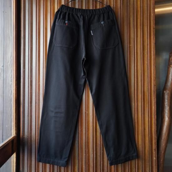 ウエストゴムでストリング入りの、イージータイプのワークトラウザーズ。ウエストからわたりにかけてはゆとりがあり、裾に向かってきれいにテーパードしたシルエットです。なめらかで落ち感のある素材なので、シルエットがきれいに出ます。ステッチの配色にもこだわった、デイリーユースにぴったりの一着。