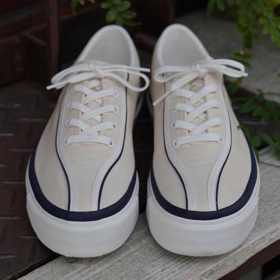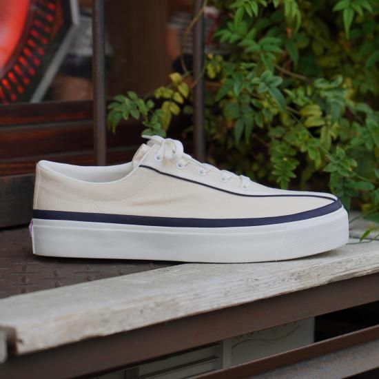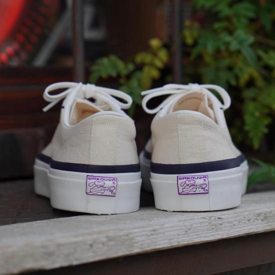 〈WAKOUWA〉は、1960年代後半〜70年代中盤のミリタリーデッキシューズをベースにしたスニーカーブランド。オーソペディックシューズ(医療用矯正靴)のストレスフリーなラストの形状を目指し、どんな足型にもフィットする唯一無二の履き心地を実現しました。また、波模様が象徴的なアウトソールは、美しいシルエットを保ちながら耐久性にも優れたヴァルカナイズド製法を採用。ユニークなヒールパッチは、ブランド名に由来されたモチーフからデザインされています。今回の別注モデルは、〈WAKOUWA〉”DECK’N COURT(デックンコート)”と”OXFORD”をピックアップ。”DECK’N COURT”は、アッパーにレザーとパイピングを配し、ソールの境目にもアクセントを加えています。”OXFORD”は、通常キャンバス地であるアッパーにスウェード素材を採用。どちらもローテクな見た目に反し、ユニークなデザインとしなやかな履き心地を兼ね備えたハイブリットな一足に仕上がっています。