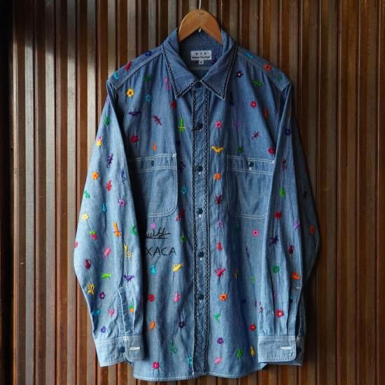 ベースのシャンブレーシャツは日本製のオリジナルの物を使用しており、そこにメキシコのオアハカで手刺繍が施されています。